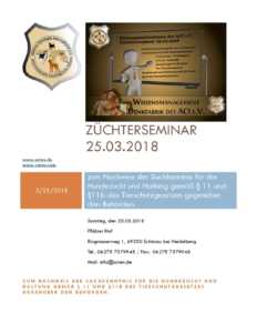 Dieses Seminar soll allen Hundebesitzern (Deckrüdenbesitzern), Züchtern und Zuchtwarten, sowie Formwert- Zucht, sowie Leistungsrichtern, Hundetrainern usw. die notwendigen Voraussetzungen der Rassehundezucht und die Fähigkeiten und Kenntnisse der modernsten Hundehaltungs- und Zuchtvorschriften, sowie die gesetzlichen Anforderungen übermitteln. Schulungsunterlagen mit gesetzlichen Empfehlungen, Vorschriften und Fachunterlagen werden selbstverständlich jedem Teilnehmer überreicht.